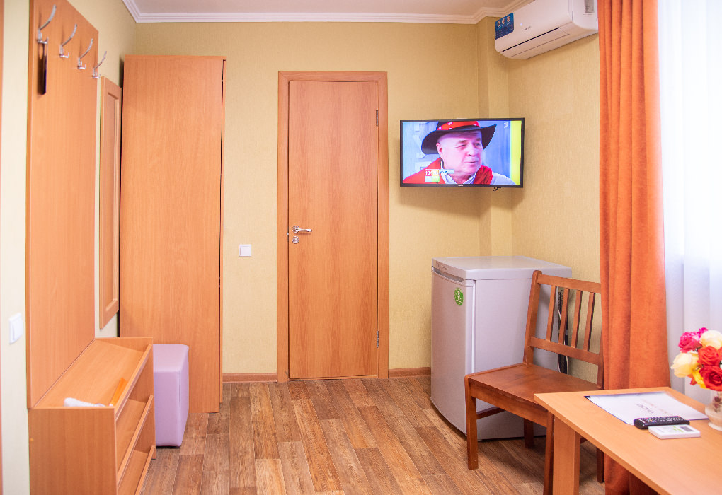 Площадь номера - 9 кв.м. 1 комната. 1 осн. место. В номере: телевизор; холодильник; сплит-система; душ; туалет; Wi-Fi; стул; 1-спальная кровать; журнальный столик; зеркало; шкаф; полотенца.